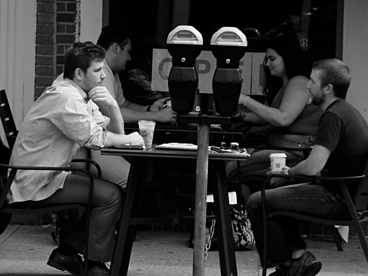 Taken from across the street, I thought this was interesting with pairs: two parking meters with two sets of diners. Titled: Double-parked