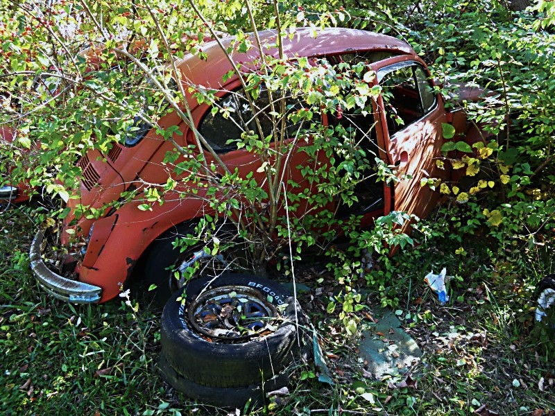 There is an import car repair place in town, and in their front area there are a bunch of old cars being overtaken with vegetation.