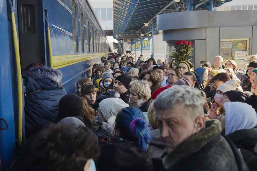 AMSTERDAM, NETHERLANDS – FEBRUARY 27: Thousands of people show solidarity with Ukraine at Dam Square on February 27, 2022 in Amsterdam, Netherlands. Russia launched a large-scale invasion of Ukraine earlier this week that has killed scores and prompted widespread condemnation from European leaders. (Photo by Cris Toala Olivares/Getty Images)In this aerial view, demonstrators gather during a protest against the Russian invasion of Ukraine in front of Saints Volodymyr and Olha Ukrainian Church in Chicago, Illinois, on February 27, 2022. – Dressed in the blue and yellow of Ukraine’s flag hundreds of thousands of people took to the streets worldwide Sunday denouncing Russia’s invasion of its neighbor. From Berlin to Baghdad, from Washington to Saint Petersburg, demonstrators chanted “shame” against Russian President Vladimir Putin while others waved banners with slogans like “Putin murderer” or “stop the monster.” (Photo by CHENEY ORR / AFP) (Photo by CHENEY ORR/AFP via Getty Images)KYIV, UKRAINE – FEBRUARY 26: Local residents are boarding an evacuation train driving to the west of Ukraine on February 26, 2022 in Kyiv, Ukraine. Explosions and gunfire were reported around Kyiv on the second night of Russia’s invasion of Ukraine, which has killed scores and prompted widespread condemnation from US and European leaders. (Photo by Pierre Crom/Getty Images)