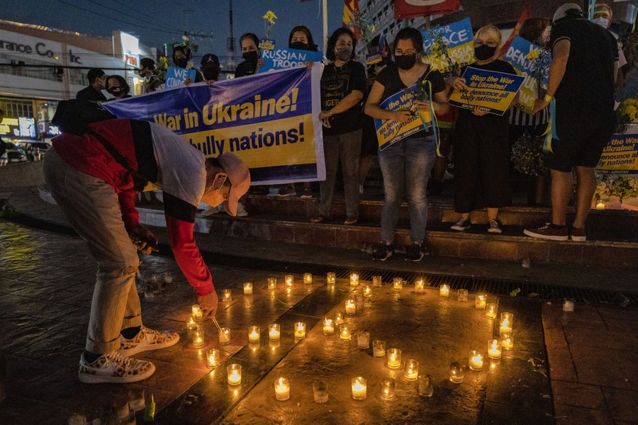 MANILA, PHILIPPINES – FEBRUARY 28: People take part in a protest condemning the Russian invasion of Ukraine on February 28, 2022 in Quezon city, Metro Manila, Philippines. Protests have erupted around the world in support of Ukraine after Russian forces invaded the country earlier this week. (Photo by Ezra Acayan/Getty Images)