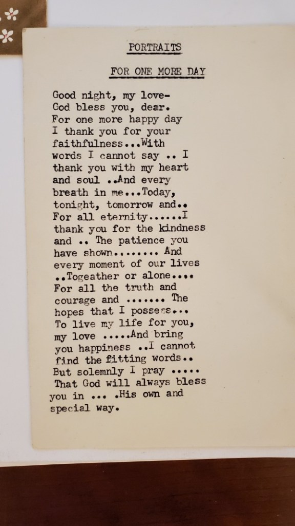 Although it took a long time, I finally got around to sorting through boxes and envelopes of old photos. I went through them three times before I was able to reduce them to a chosen group with which to make a photo album of Mom’s life. The album is large, so when I took it to share with Mom, I gave her individual pages so that she could more easily view the photos.