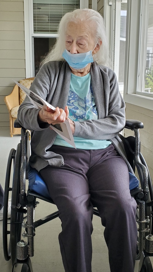 Our socially distanced visits are in an enclosed porch area. We could go into the garden area, but Mom likes to be warm. We had one visit on a lovely day outside in the courtyard, but the rest have been in the sheltered porch area away from the wind. Now that day temperatures are getting a bit cooler, staff have made sure she has her winter coat on when we visit. Like many elders her age and her size, her preferred indoor temperature is at least 82 degrees. Ugh.